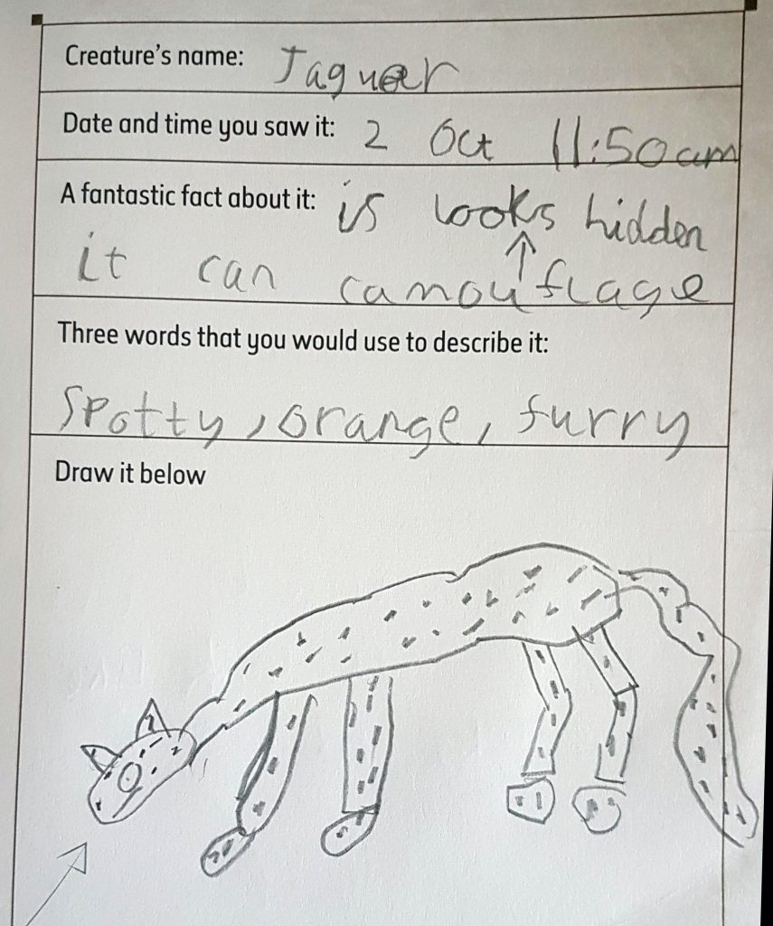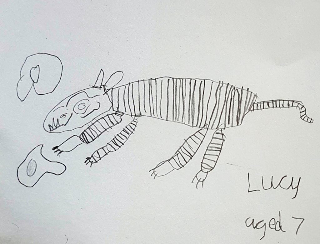These next two pieces are by my seven-year-old niece, Lucy. She drew this leopard and tiger from actual specimens in the Natural History Museum. She then, logically, had to add meat, because the tiger was hungry!
