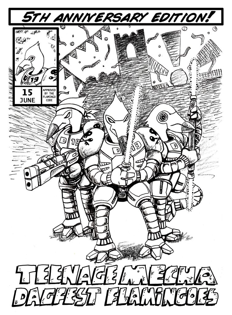 The first, Teenage Mecha DagFest Flamingoes, was a T-shirt commissioned by Creative Barking and Dagenham for the fifth and final DagFest, 15 June 2019. Unfortunately, the T-shirt never saw the light of day, as the onsite printers had to pull out. The design was inspired by the Teenage Mutant Ninja Turtles – the franchise was instrumental to Danny learning how to draw comic book style illustrations – and flamingoes, a popular DagFest theme.