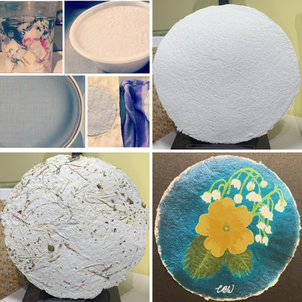 The pictures below show the steps Charlotte took to create her paper, the results and finally an acrylic painting on her homemade paper.
