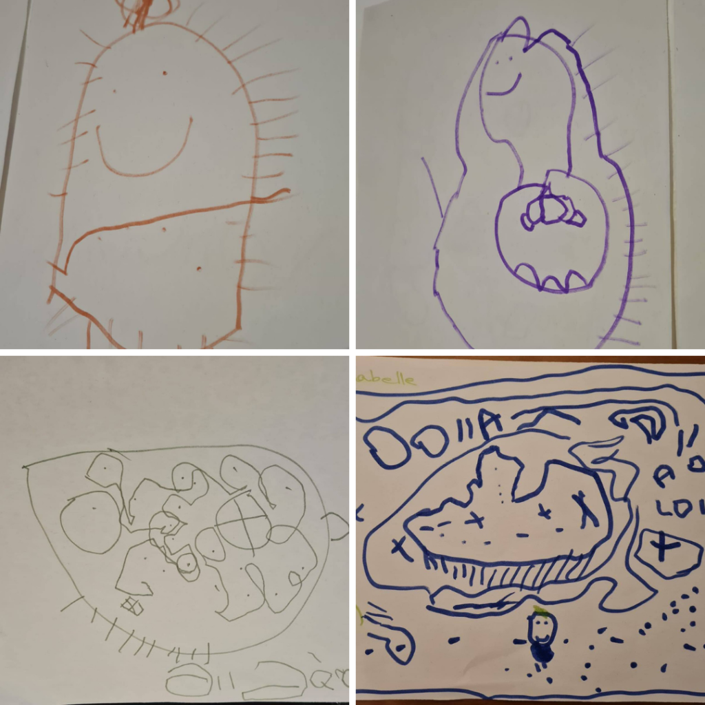 Last, but by no means least, we have some very creative drawings from three and three quarter-year-old, Anabelle Buss (the three-quarters are very important, apparently!). I do have questions about that treasure map, though. Is there treasure at all the X’s, or are some of them decoys or traps?