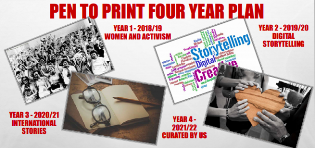 The Project Manager Lena Smith described the professional development benefits for herself and her growing staff, “If it wasn’t for Pen to Print I would still be in a branch library working as a Library Assistant. Being involved in the project has allowed me to expand my horizons, discover new opportunities that I never expected to be available to me and has enabled me to progress to a more senior position than I would ever have expected to achieve. I am now looking at developing my career further. Since Pen to Print secured funding from The Art Council as an National Portfolio Organisation (NPO) we have been able to create new job opportunities which has allowed me to support more people to develop their career in the arts within the project and create a sustainable future for Pen to Print.”