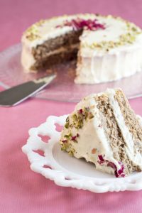 Finish the cake with two concentric circles of vibrant pink dried rose petals and crushed pistachios and dot a couple of rose petals in the centre. This cake is a stunner! It tastes best after resting in the fridge for a couple of hours, as this helps the flavours meld together and makes the cake easier to cut.