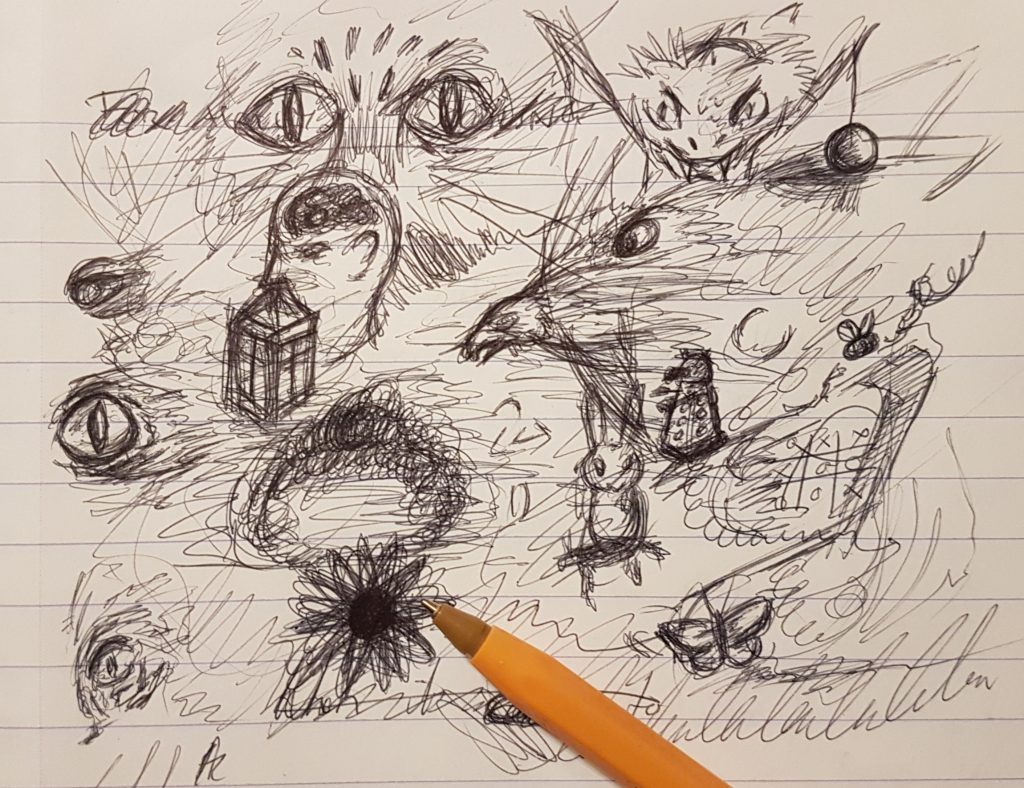 As an artist, I doodle to try out ideas and practise techniques, such as trying to work out a composition, the best pose for an animal, or which direction light is coming from, so I know where to add shadows. Doodles are quick, simple and less stressful. They differ from a sketch or design, as, for me at least, they are the moment that initial thought moves out of my brain. They’re the ‘draft zero’; not meant to be seen by other people until refined into a proper idea. They’re not meant to look good, or show off your talent. If someone asked me to draw a doodle to purposely be shown or sold, it would actually be a detailed sketch, and I’d work longer on it; not the minutes or seconds they’d usually take.