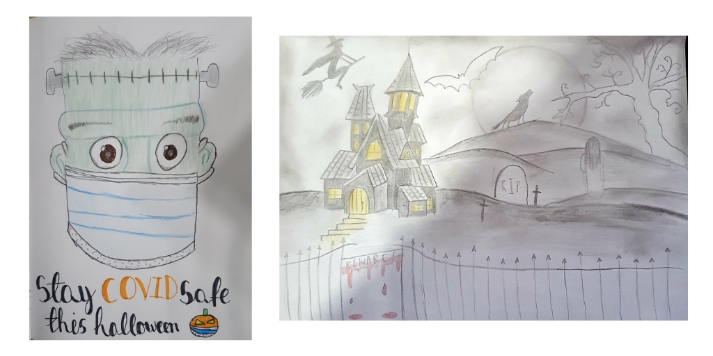 Stay COVID Safe This Halloween by Saniya Iqbal (age 12) and Halloween Scene by Zahra Chowdhury (age 13)
