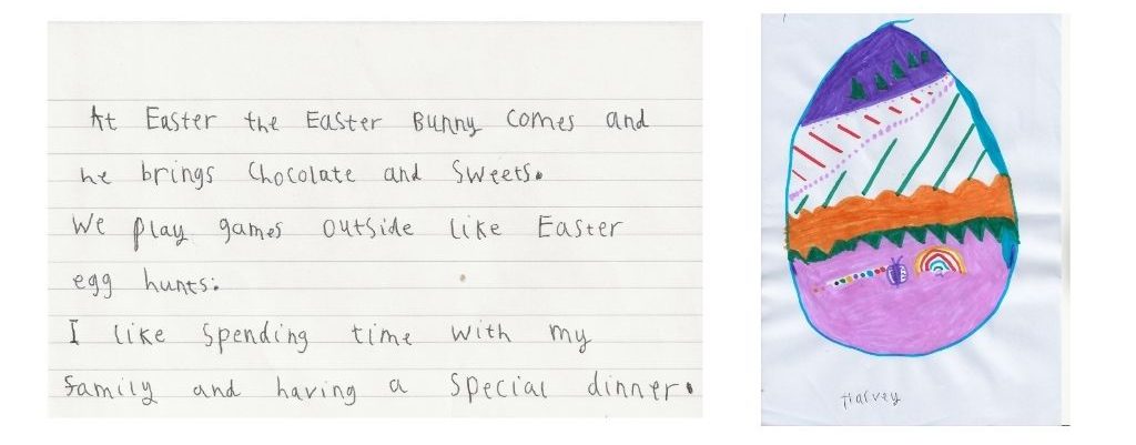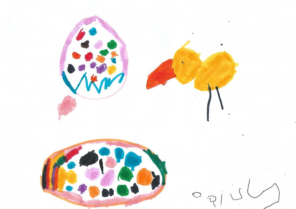 This Monday, I’ve asked contributors to bring all of that onto my page. As I can’t see my niece and nephew this year, I started at home and asked them to help out. Here are Harvey (seven) and Daisy’s (three) Easter drawings.