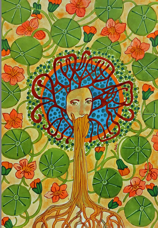 I live in a rural area next to a forest, and nature has a big influence on my art and writing. For this illustration, I drew on the influence of art nouveau, an artistic style I’ve admired since I was first exposed to it as a child. The idea of art nouveau was to focus on bringing nature back to modern life. As it is for myself, the natural world was a central inspiration for art nouveau. Moreover, I find nature to be more balanced than our current modern world. In my illustration, I use the symmetry of the circular Nasturtium leaves in harmony with the round shape of the treetop, to create the illusion of balance. The woman’s face in the tree is a nod to the sacred feminine, a concept that suggests God is neither male nor female, but a divine essence balanced with both.