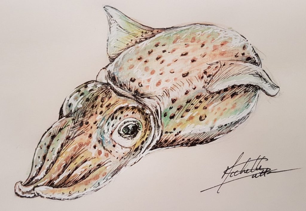 I’m sure you’ve heard of bioluminescence: light created inside the bodies of certain creatures, giving them the ability to glow and glitter in complete darkness. My favourite example of this is an animal I recently drew, called the Bobtail Squid. Their bioluminescence is produced by host bacteria that live in their underbellies. It’s a symbiotic relationship: in exchange for food, the bacteria emit blue light, which helps the squid with camouflage.