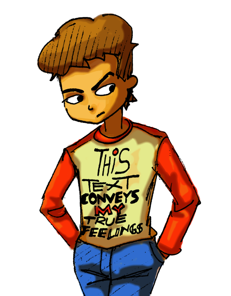Now, I’d like to share some original artwork, Convey Boy, by Danny Baxter. I loved Danny’s take on my theme, which he says is, “A play on the idea that people communicate with slogans on their T-shirts, which invariably tells you something about them.” I like the idea that people inadvertently reveal things about themselves – perhaps more than they intend to – through their clothing, or in the ways that they present themselves more generally. Even though we don’t know anything about this character, we get a sense of their outlook. As Danny told me, “It tells us something about this guy’s relationship to the trend: maybe cynicism or a humorous take, or a bit of both.”