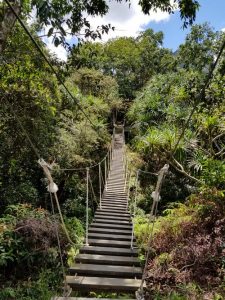 She loaded up her gear and turned her attention to the bridge. Reaching for the rope, she wrapped her fingers around it and was surprised at how tight it was, just like the high-tensile wire they used back home on the dairy farm fencing. With both hands clutching the ropes at shoulder height, she stepped onto the wood. With each step, the plank wobbled more from side to side. Fifteen feet along, it got out of control.