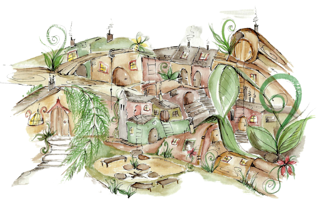 The Tuft is home to many other mushroom families too. If you look closely enough, you can see weeny windows of light and colour amongst doors of all shapes and sizes. There are higgledy-piggledy chimneys piping out smoke and steam from the welcoming warmth within. Yes, a bustling little network of mushie homes all connected within the wood. It may not sound very homely, but old rotten wood, rich in nutrients and moisture, is the perfect spot for mushrooms to live.