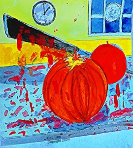 Plop… plop… plop. Plop… plop… plop. Awake, groggy and now vocally grumpy, I made my way back into the yellow-painted kitchen. Determined to stop the new slower annoying version of torture, my searching hand finally found the light switch and flicked it on. I had to abruptly stop mid-step on my way to the sink . I tried and failed to muffle my high-pitched screams. A large bowl of apples, all sliced in half and covered in blood were sitting on my long granite counter top. As if this sight wasn’t bad enough, among the butchered apples was a bleeding right hand. Someone had firmly stuck a knife in the person’s back and placed the individual on top of the counter.
