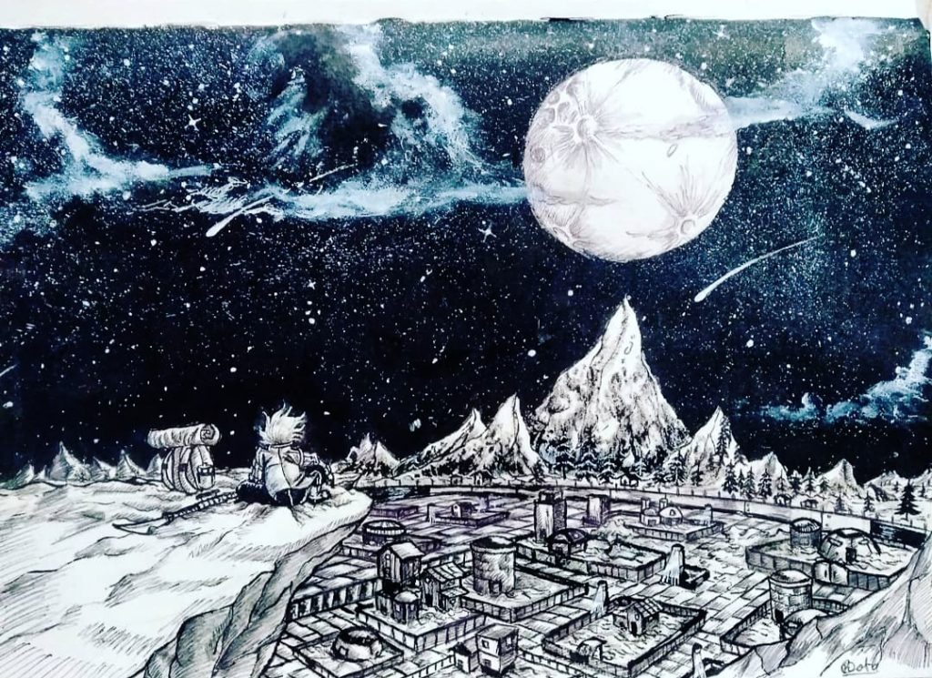 Lastly, I wish to share a sketch by Rhyv, exploring the idea of home. This image features a person with a telescope overlooking the earth below him, while being curious about the space above. The image makes me wonder whether he finds home among the stars, or on the land below?