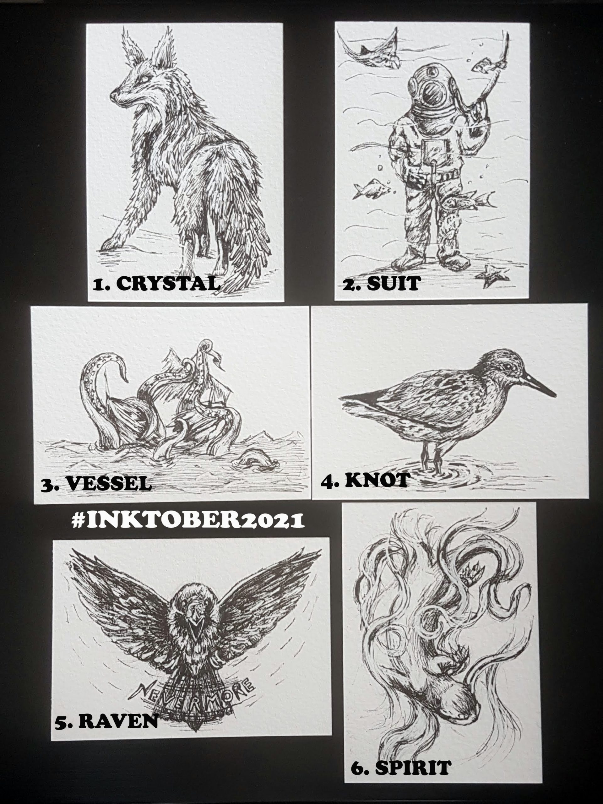 Currently, I’m taking part in Inktober – an annual challenge to produce daily art that fits specific prompts. This year, I’m creating small pen drawings as ACEOs (Art Cards Editions & Originals) or ATCs (Artists Trading Cards). You can see the first six of these below, along with one of my painted rocks. If you’d like to see more, you can connect with me on Instagram: @msuttonartwork.