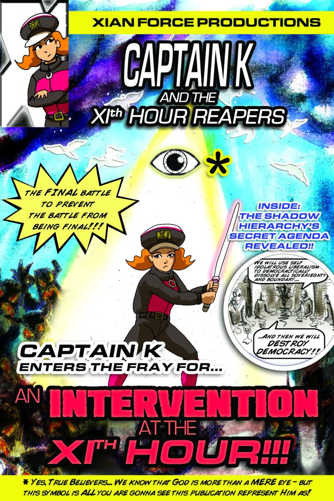 His second piece, Intervention At The XIth Hour, a poster as part of his Who Is Captain K? installation in the Not So White House Exhibition (part of the White House artist residency programme) in October 2018. It’s a digital image made from mixed media collage, in the style of a spoof comic book cover.