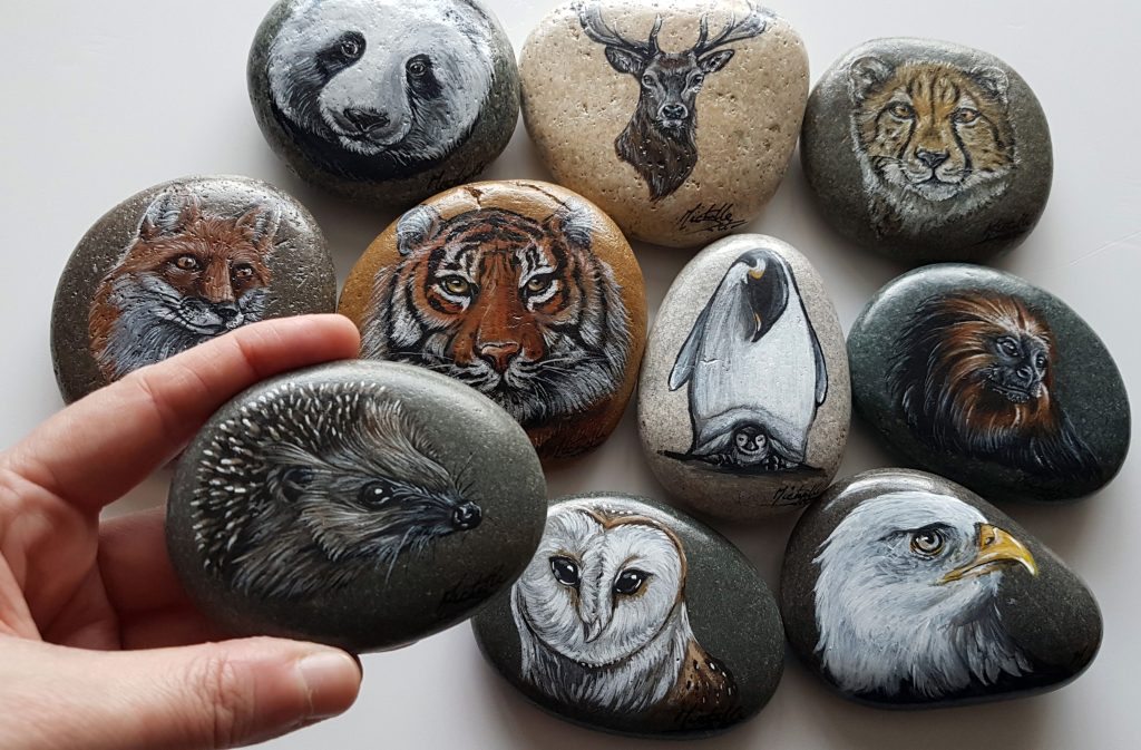 I describe myself as a wildlife and rock artist, but also produce wildlife artivism pieces. I work in a variety of media, including: acrylic paint, pen and different pencils (graphite, coloured, watercolour, inktense & pastel), and I like to mix them as well. I also work on different surfaces, paper, canvas, wood (inc. reclaimed), pebbles and rocks. I recently completed a mural on some metal doors for the Friends Of Bush Hill Park, in Enfield, which is the biggest I’ve ever worked to date.
