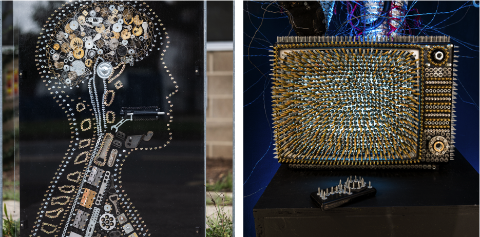 Now, we have sculptures made from reclaimed items by local artist, Griffi. Griffi has a multidiscipinary approach to work, exploring areas of neuroscience, physics, psychology, philosophy, semiotics and cultural studies. Griffi’s work is usually intricate and complex, automatically and systematically made, posing subliminal questions and producing subtextual messages. Using an array of reclaimed materials such as screws, nails, kitchen utensils and other building paraphernalia, the artist makes collages and sculptures mixing new and old objects, some of which have been donated from local people and building sites. Griffi also works as a creative producer at The White House Dagenham, collaborating with makers, designers and other artists to deliver workshops and support for local people and their community.