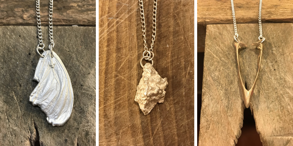 Some people wouldn’t think so, but jewellery making is an art form as well. Katie Yexley creates jewellery in her spare time from natural forms cast in sterling silver, bronze and copper. Below are examples of her work: a sterling silver stone necklace, a sterling silver butterfly wing necklace and a bronze beak bone necklace, all on silver chains.