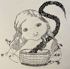 A basket of herbs by her side