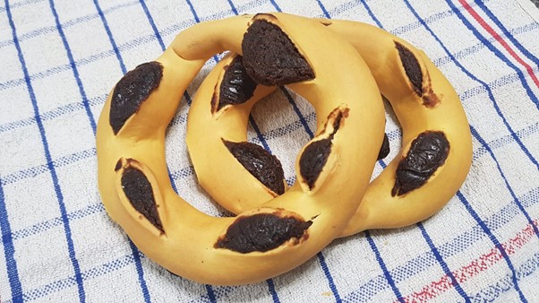 Roll out the pastry into 10-inch long strips and three-inch wide. Add some of the filling in each and form long tubes (using a bit of water as ‘glue’). Join the ends of each roll to form a ring, then, with a sharp knife, cut two-inch slits on the top of the pastry.