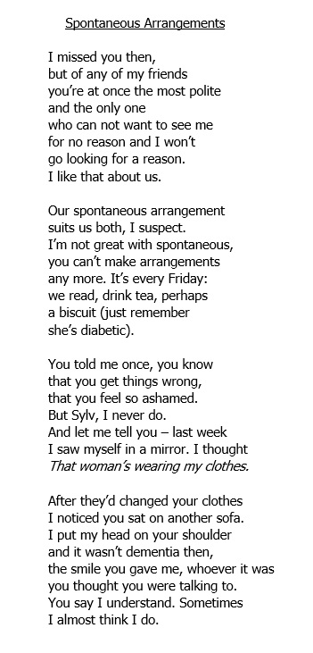 The next two pieces reflect on changes in people, physical and mental, that we can notice and respond to in our own unique ways. Thanks to Carolyn and Claire for sharing these personal pieces.