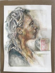 For last week’s ‘Standing Together’ theme, Pauline allowed me to use her trio of portraits (called Sky Arts celebrity portraits). She has painted this portrait of her mum: Cherry With Pink Cup in lockdown, but she hasn’t been able to deliver it yet.