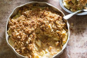 Set on a baking tray and put in the preheated oven for 35-40 minutes, until the top is golden and the apples feel very soft when you insert a small, sharp knife.