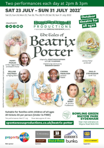 You can see The Tales Of Beatrix Potter from Sat 23rd July–Sun 31st July in Mayow Park’s Bowling Green, Sydenham, SE London. Two performances per day at 2pm and 3pm (no shows on Wed 27th July). The show lasts 45 minutes. For more info and to book tickets: spontaneousproductions.co.uk