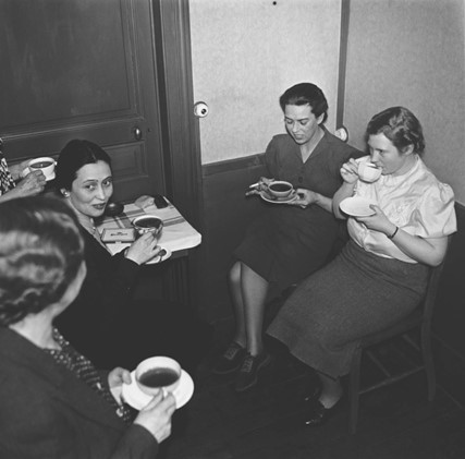 In a photograph taken in the spring of 1939, Jeanette is pictured with Reeder and Canadian mother-daughter librarians Evangeline and Olivia Turnbull. A caption on the back of the print reads: At four (p.m.), women leave the library in charge of the men and slip upstairs to a small cubbyhole for tea. Fifteen minutes later they take over (and) the men finish the tea. (American Library in Paris archives)