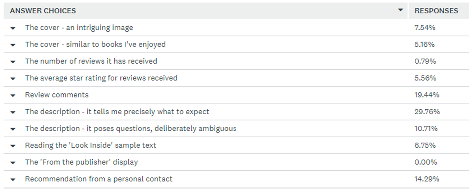I posted this survey on a variety of Facebook reader groups, avoiding if possible anyone who knew me, and groups filled predominantly by fellow authors. I was happy with the volume of responses –approaching 300 – enough to make the results statistically significant. Some respondents messaged stating they used several measures ahead of clicking the Download button to access a novel. I accepted this would be the case, but wanted to identify the first thing they turned to, the one that would tempt them towards further consideration.