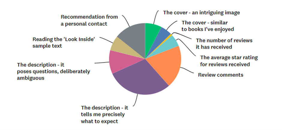 Recommendation from a personal contact with 14% is clearly important (so please recommend my novels to friends!). Reading the ‘Look Inside’ sample text (6.75%) is low. You’d think people might want a quick read before deciding what to buy. Mind you, I rarely do that myself.