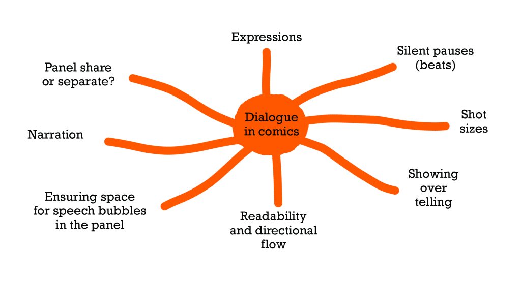 The focus on this session was dialogue. I was very happy that Habib, the facilitator from Pen to Print, was game in reading out an extract from the play with me. After we’d impressed everyone with our top-notch acting skills, we went back to the world of comics by considering different ways dialogue can be read within the medium. Speech bubbles are a well-known tool in comics, but when do characters share a panel and when do they have their own? When is it a good idea to have a panel with no dialogue, allowing facial expression and body language to fill a ‘beat’ instead? What kind of pacing are we after? It’s always a good idea, when working with text in a comic, to plan where your text is going to go before you start drawing. And, remember, in the West, we read from left to right!