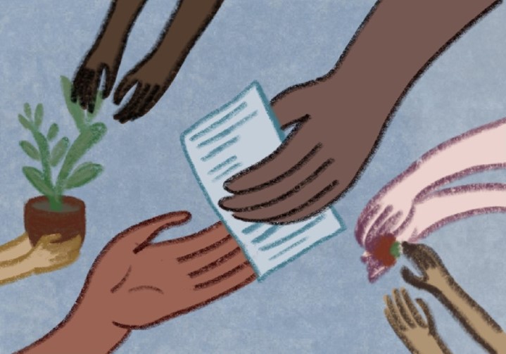 From this point, I made a few sketches of ideas before looking at stock photographs of volunteers. I wanted to meet the brief and ensure that I didn’t portray volunteering as exclusive or closed off to specific groups of people. I searched for a mix of activities to encompass a realistic group of volunteers in the UK. My sketches can be seen in image six.