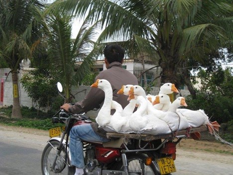 Caption: Beijing gentleman biking with more than a half-dozen geese riding in the back