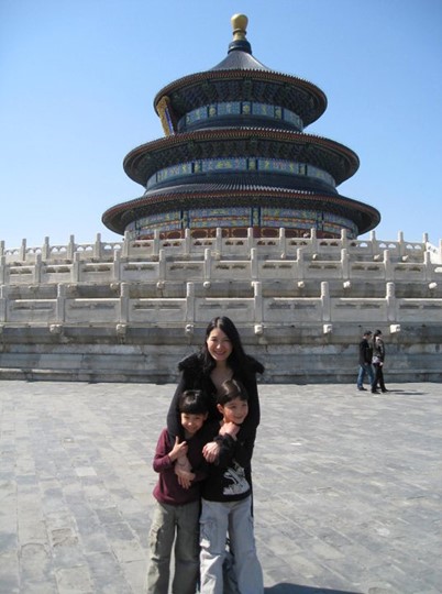 Caption: The author and her twin sons at Beijing’s famous Temple Of Heaven