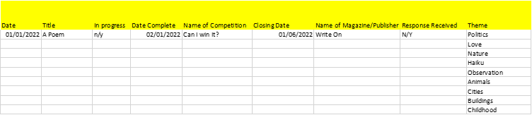 If you’re able, you can keep a catalogue or index of your works and their progress using an Excel document to keep track of what, when, where and how. See the example below: