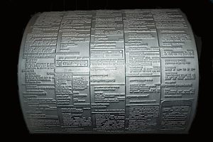 supplied, the order and position having been provided from the make-up, cut and paste operation. This collection of thousands of pieces of lead constituted a whole newspaper page, in reverse. These frames of type were then tightened with wedges called ‘quoins‘ and the whole thing became a solid mass of metal, called a ‘forme‘, which was then passed to the matrix machine. A large sheet of thick, wet, floppy paper was placed over the forme and the whole thing placed under tremendous pressure and heat. When it came out of the press, minutes later, the thick wet paper had become a flat, rigid matrix of the forme, from which several lead printing plates could be cast.
