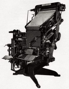 We first saw the newspaper being ‘made-up’, which consisted of strips of paper, each being a column of print, that were cut and pasted using scissors and glue. These column strips of type had been set on linotype machines. A linotype machine looks like a naked grand piano standing on end with a typewriter keyboard instead of keys. There were two rows of these machines, each with its own pot of hot lead from which the machine cast its own type in solid, single lines – hence the name: Linotype. Each machine was controlled by a man who sat at a keyboard copying a manuscript he had received from a journalist in the newsroom. When he had typed a row of type, the matrixes of the letters would be lifted automatically to the side of the machine, where they would be cast in lead into a single line of type from the pot of molten lead mounted on the side of the machine. The small brass matrixes, from which each letter had been cast, would then be lifted by a mechanical arm to the top of the machine, where they would be sorted by gravity into their correct position, ready for use again. The whole operation was open to the eye, quite noisy, and fascinating to watch. The typing speed of these men was incredible. Normally, only female secretaries knew how to type in those days, so it was quite extraordinary to see middle-aged men dressed in working overalls being masters of a typewriter keyboard. There were two rows of around a dozen such machines, so you can imagine the noise they made!