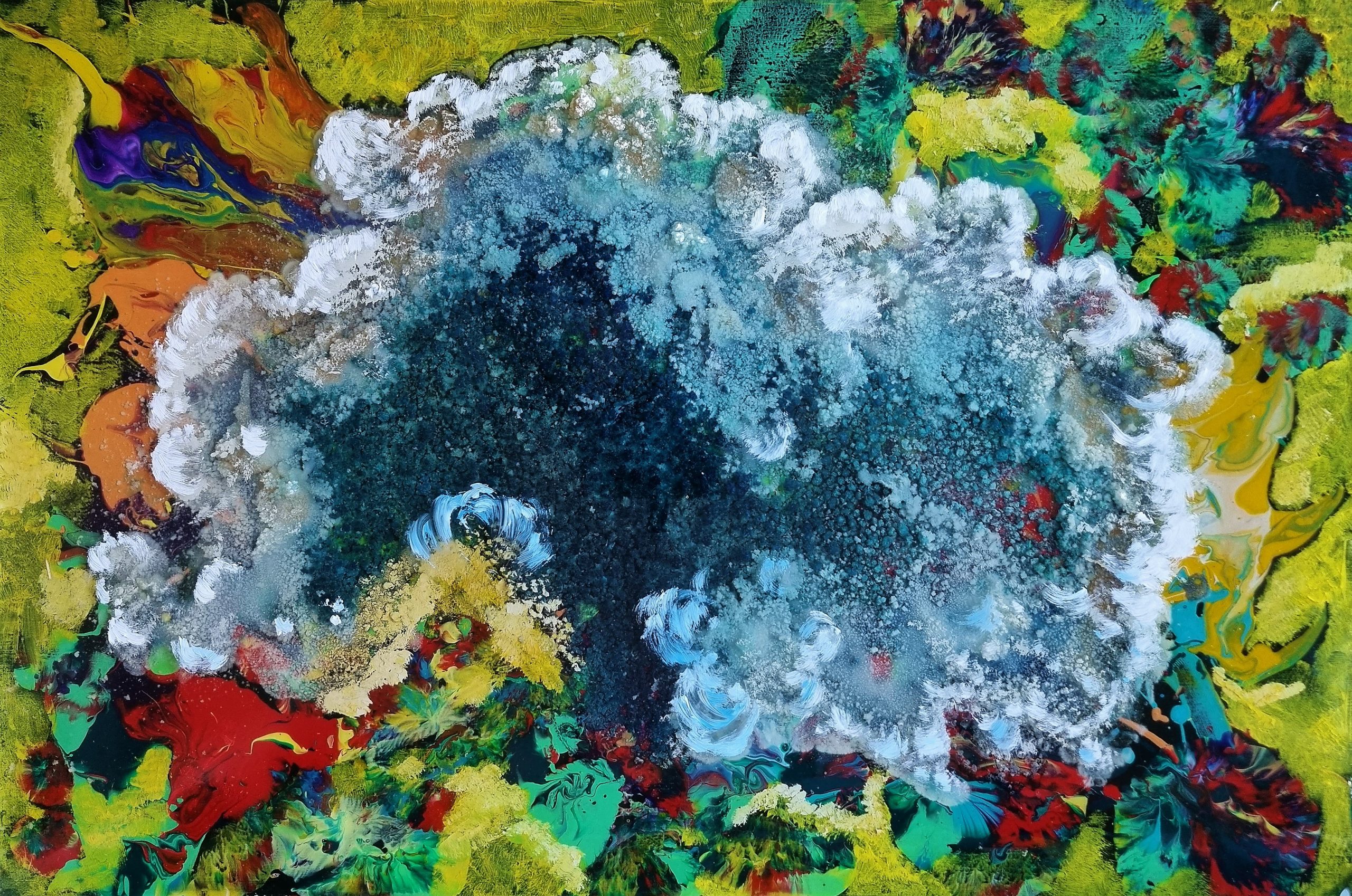 So, I looked at unique ways of experimenting with materials that could perhaps represent the world I wanted to show. I used substances with the potential to kill a person when inhaling them and mixed these with paint and resin. Through an elaborate technique and accurate measurements, I’ve recreated a world frozen in an ice age; akin to a remembrance of what we’ve lost. Human activity is changing the Earth’s climate in ways unprecedented for thousands, or hundreds of thousands, of years, with some of the changes now inevitable and irreversible. These include sea level rises, the melting of polar ice, the warming and acidification of the oceans, and the loss of biodiversity.