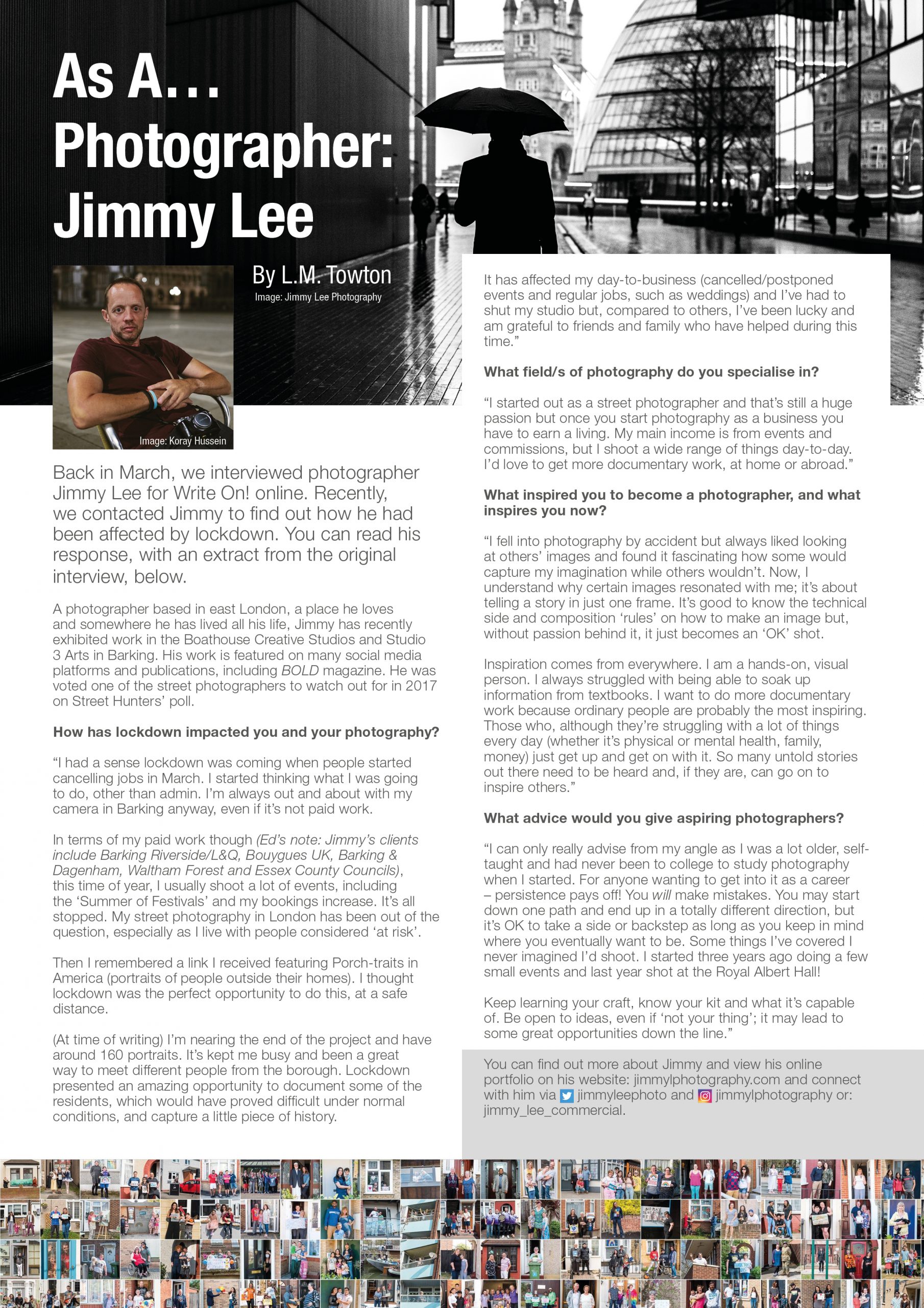 Welcome to the sixth of our digital pull out pages, drawn from Write On! 5. Today’s page is an interview with photographer Jimmy Lee. As we continue to face the repercussions of lockdown, issue 5 remains digital.