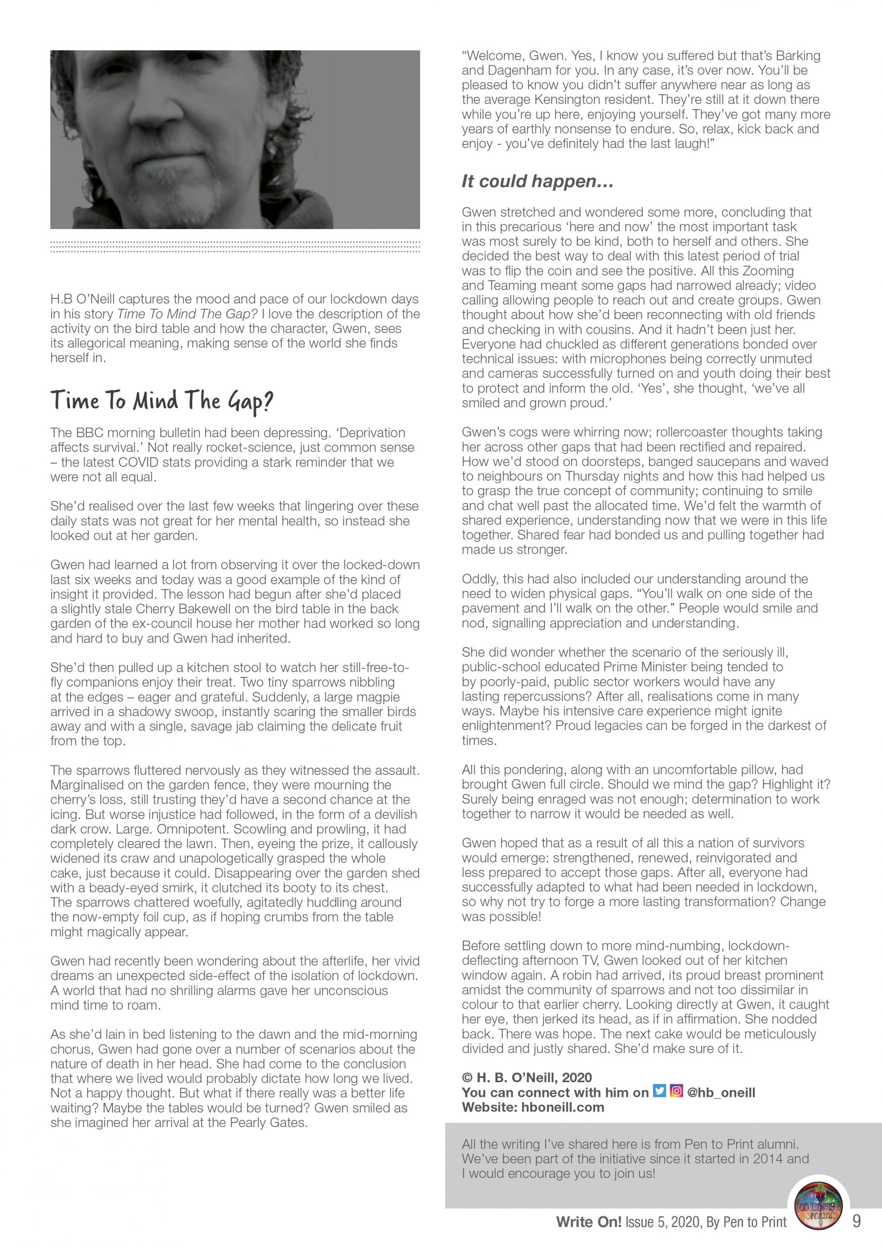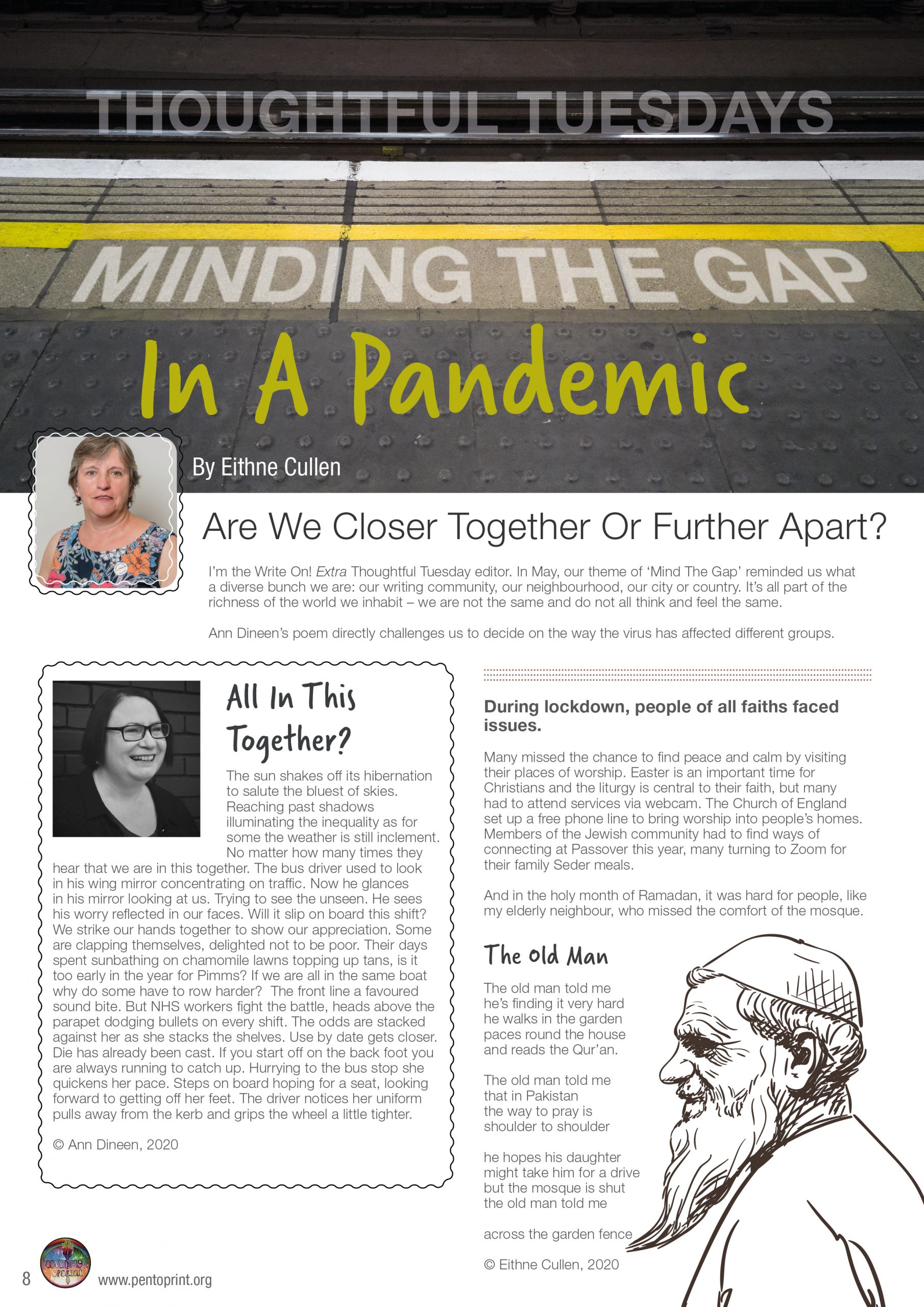 Welcome to the eight of our digital pull out pages, drawn from Write On! 5. Today’s page is a look back at one of our favourite Thoughtful Tuesdays: Minding the Gap In A Pandemic. As we continue to face the repercussions of lockdown, issue 5 remains digital.